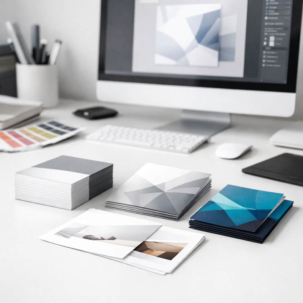 Wir gestalten professionelle Designs und produzieren hochwertige Druckprodukte wie Visitenkarten, Flyer und Geschäftsausstattung. Klar, modern und perfekt abgestimmt auf Ihren Markenauftritt.